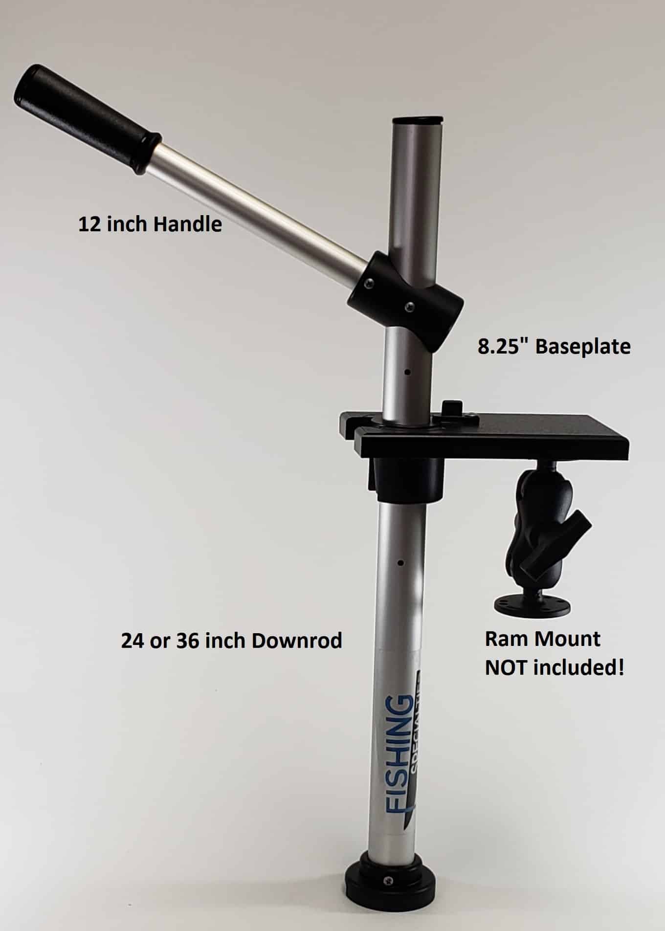 Kayak downrod system works with all baseplates.ย It is 24 inches long and includes a cone and handle.