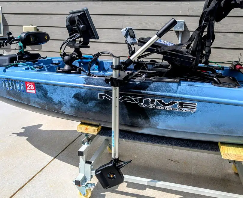 NOTE: It is not recommended to mount a baseplate directly to the kayak without some intermediate mounting. Direct mounting will mean the baseplate will take all the force should the downrod contact underwater obstacles. Thus it is likely that the baseplate itself will break or tear screws out of the kayak. The nylon Thumbscrews that hold the assembly together act as a replacable strain relief and so it is strongly recommended that some form of mounting be used.
